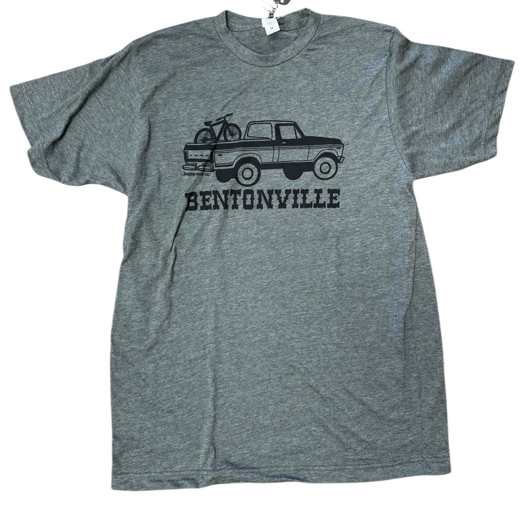 This is Bentonville F150 shirt with a bike in the back. What is more Bentonville than Sans truck with a bike in the back. It is printed on a charcoal adult unisex tee. It is soft and comfy, preshrunk and true to size.